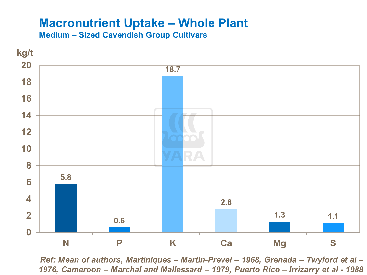 Phosphorous needs are small, generally less than 1kg/t of plant and fruit in Cavendish bananas. The crop requires a constant supply throughout the growth period.