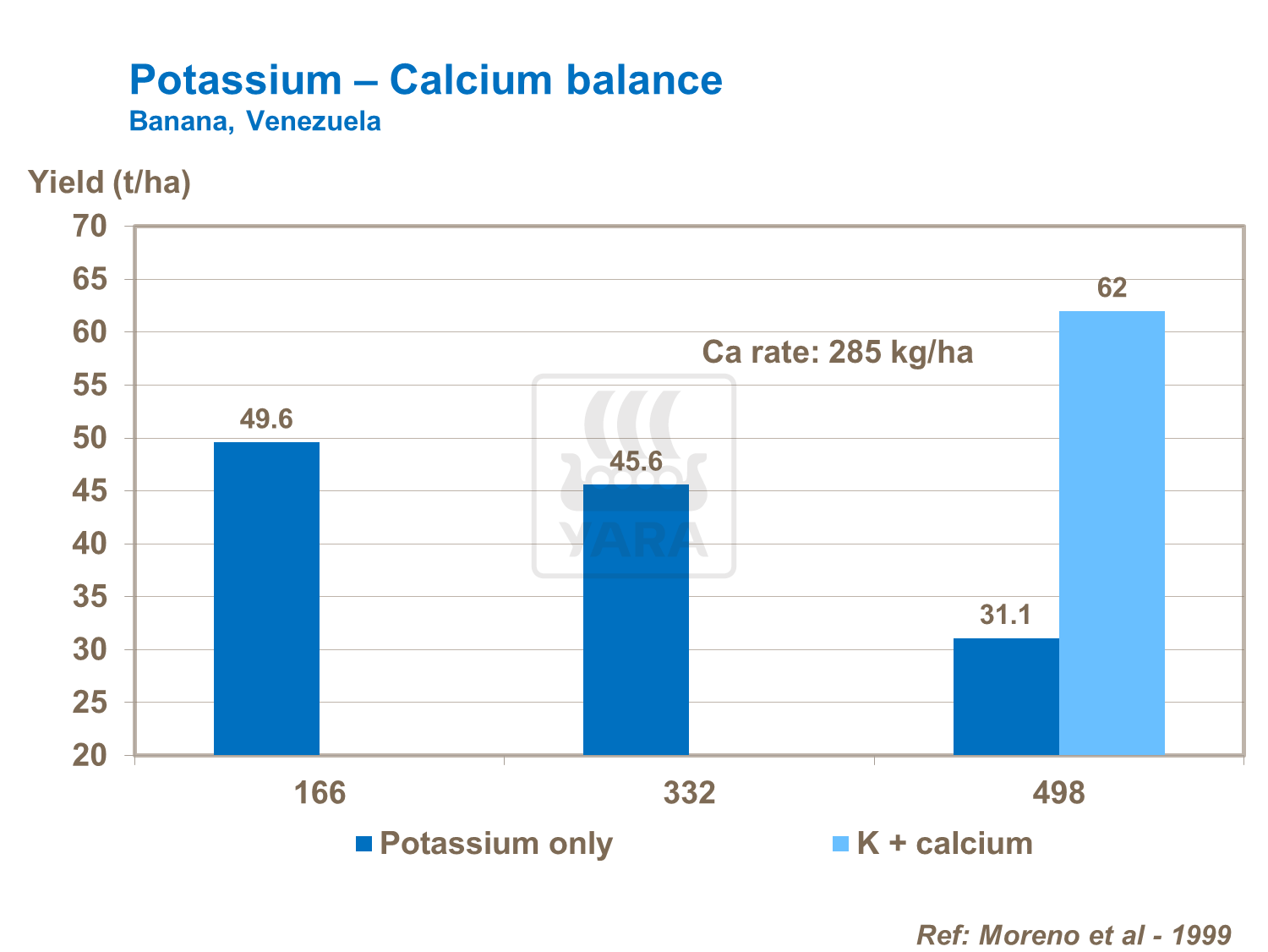 This is graphically illustrated in Venezuelan trials where excessive use of potassium depressed yields through restricting calcium uptake. When calcium was applied in-balance alongside these high levels of K, yields increased.