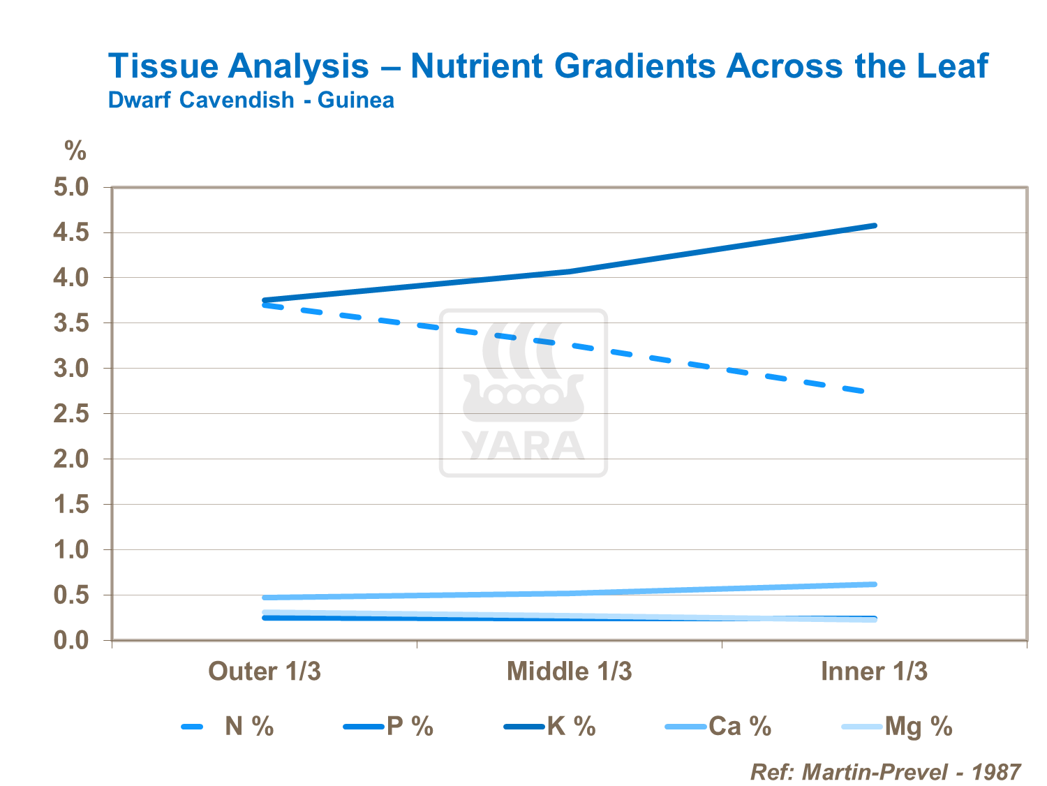 It is important to be aware of which of these methods has been used as the accepted optimum leaf nutrient standards vary according to the analysis (Table 4) and the exact section in the leaf strip that is tested.