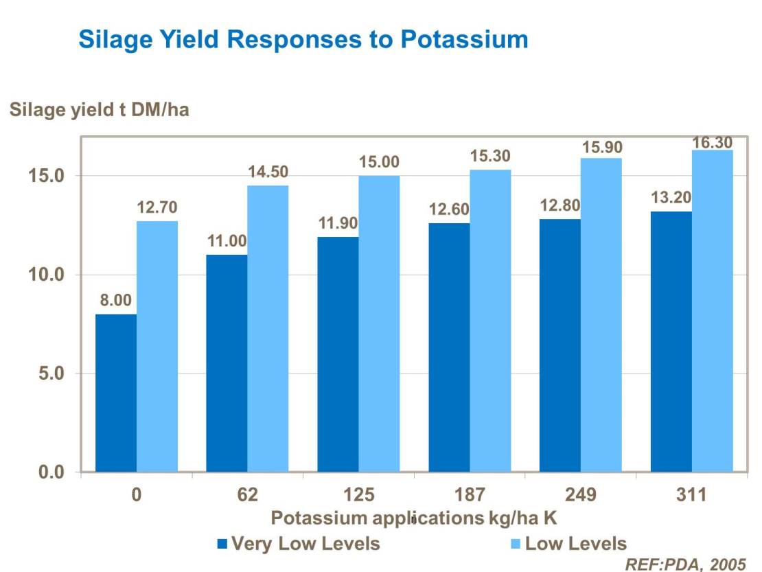 Potassium is the nutrient taken up in the greatest quantity by pasture swards. Potassium has a wide-ranging role in the plant affecting nutrient uptake, photosynthesis, rate of growth and feed value.
