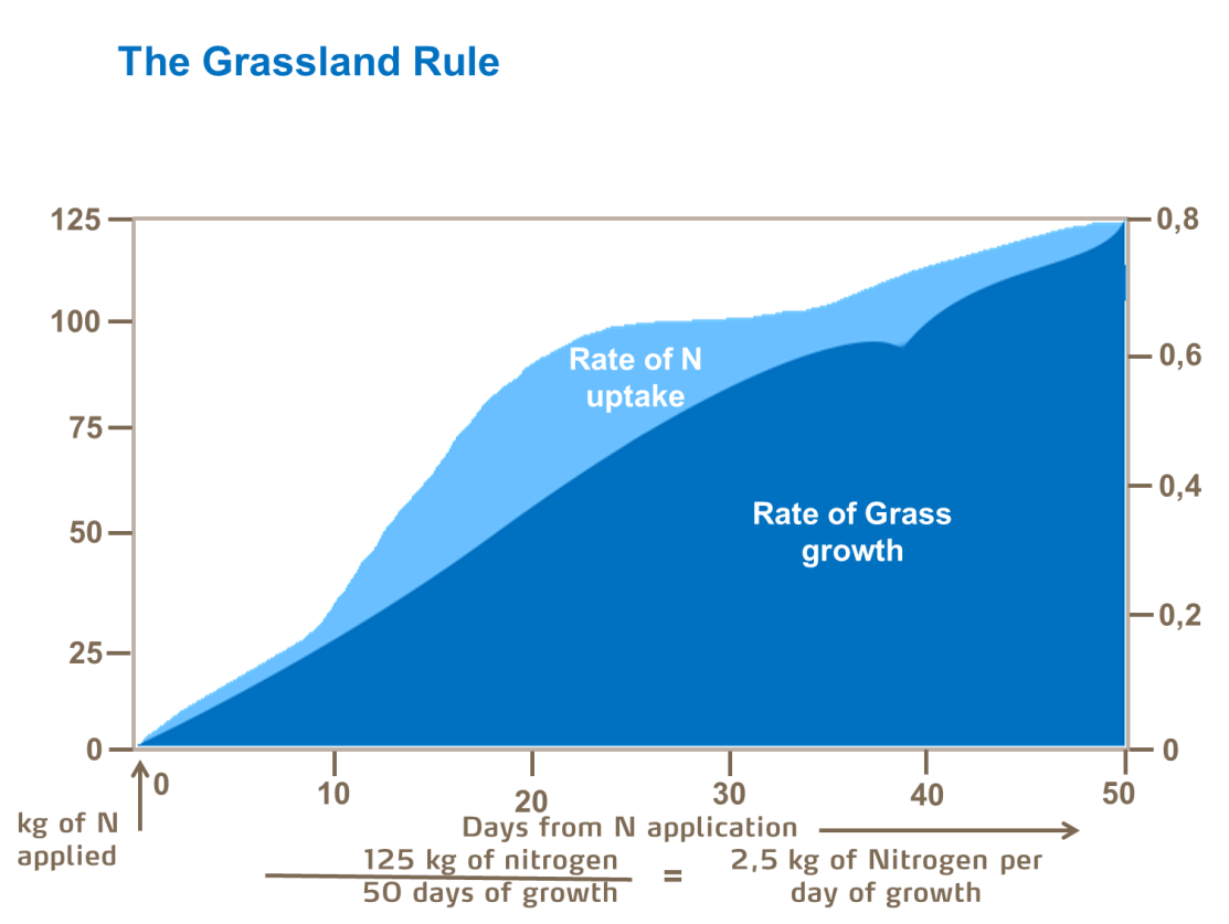 Nitrogen is taken up by grass species quicker than it is incorporated into proteins and other structures so to allow optimum efficiency sufficient time must pass between application and cutting or grazing. This has led to the development of the Grassland Rule to apply nitrogen at the rate of 2.5 kg N/ha/day achieve optimum production efficiency.