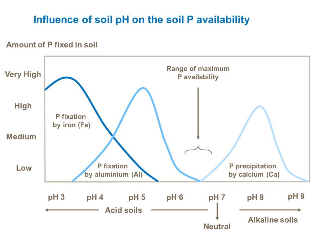 Phosphorus is very immobile in soil and its availability is limited by pH, by distance from plant roots and soil temperature.
