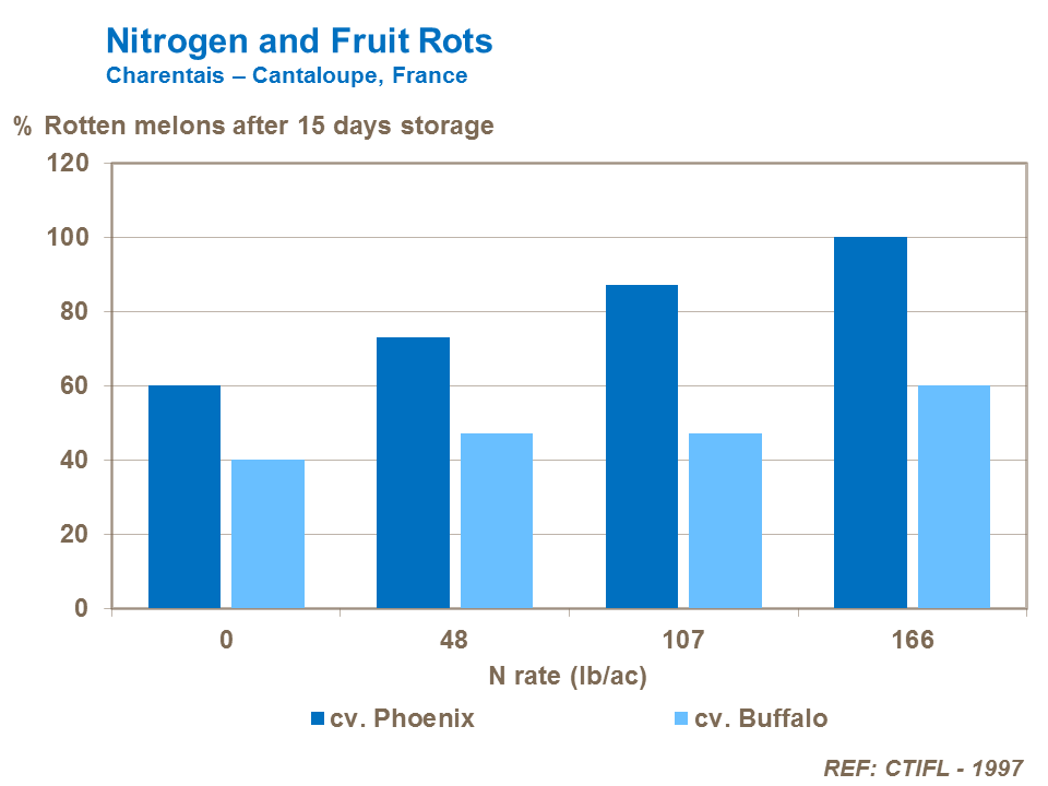 Too much nitrogen at later stages of growth can spoil fruit quality by increasing the level of blemish on the rind and encouraging fruit rot. Thus, it is important to confirm rates and timing following local trials that take into account the need for high yield, but also good quality fruit.