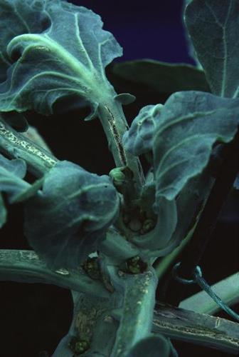 Boron deficiency leads to scarred and corky spots on petioles and stems. Leaves are brittle and deformed. Petioles may show cracks or become hollow.