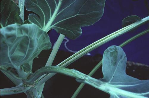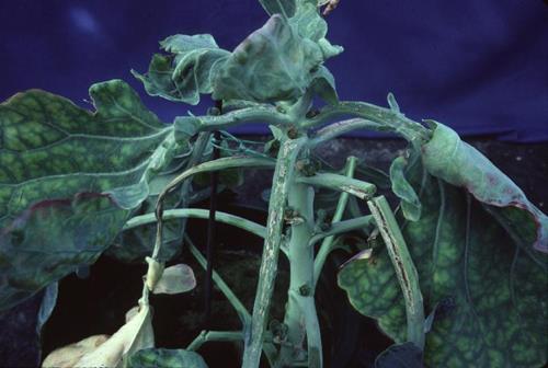 Boron deficiency leads to scarred and corky spots on petioles and stems. Leaves are brittle and deformed. Petioles may show cracks.