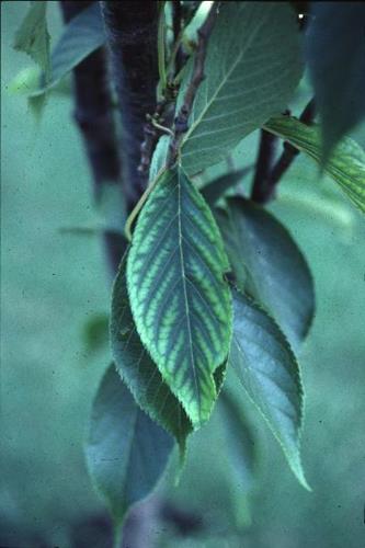 Interveinal chlorosis and bright yellowing develop first on older leaf margins and tips and spreads back to the main vein. The leaves often have a characteristic herringbone pattern of chlorosis on new season’s growth. Symptoms are normally most obvious later in the season during fruit