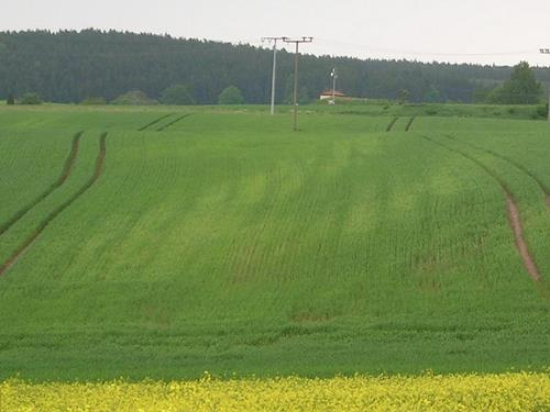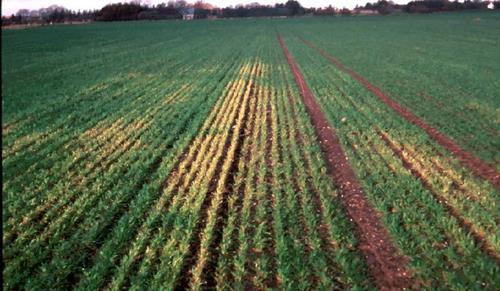 Characteristic symptoms of Mn deficiency are the dark green tractor lanes within the chlorotic area. Here the soil is compressed and less Mn oxidation occurs.