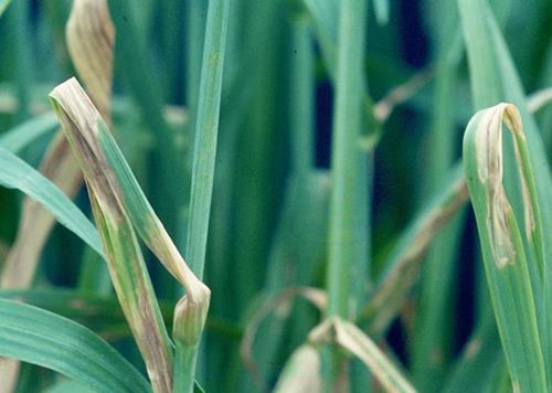 Leaves have grey specks or light brown lesions and they break/bend over near the centre section. Some leaves show signs of chlorosis which eventually hides the lesions.