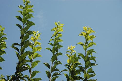 The severity of the chlorosis increases towards the youngest leaves at the tip of the shoot.