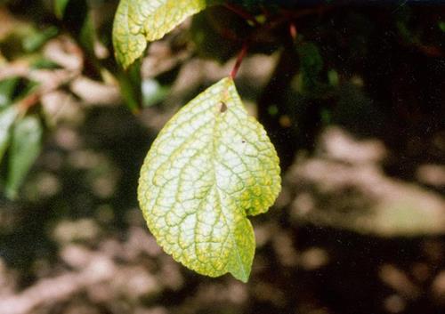 Deficiency leads to characteristic chlorotic yellowing, and sometimes bleaching, of new leaf growth. Leaf veins remain green.