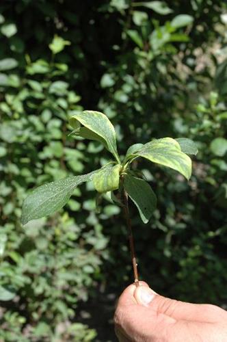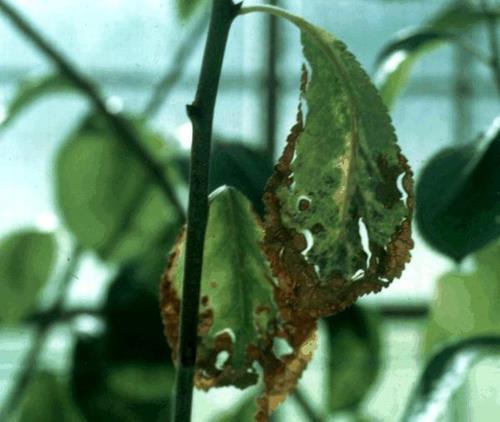 In severe instances, leaf margins become necrotic, curl up, and leaves die and drop prematurely. Only a few tufted leaves remain at the tip of the branches.