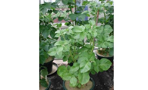 The pale green leaves (left) are reduced in size and growth is stunted. Symptoms often seen on younger leaves first.