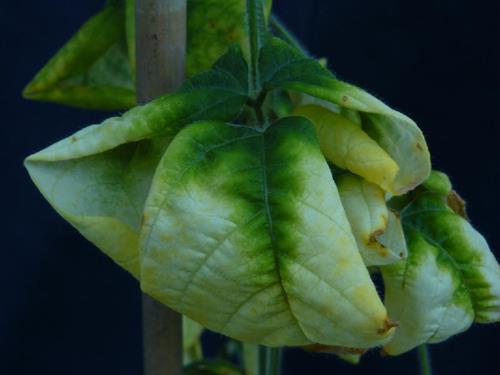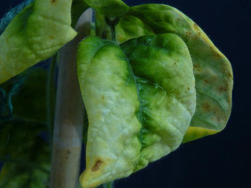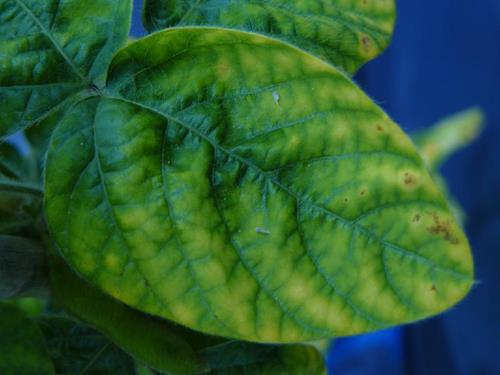 Already far advanced chlorosis. The leaf is almost completely bleached, only the midrib and the adjacent area are still green.